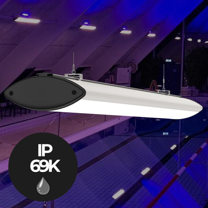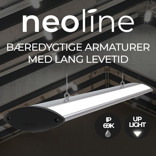 Neoline armaturer er oplagt til sportshaller, lagerhaller, værksteder, kontorer m.m. og fås i flere modeller, som alle er 150 cm, 4.000 kelvin og DALI-dæmpbare samt kompatible med bl.a. Casambi.