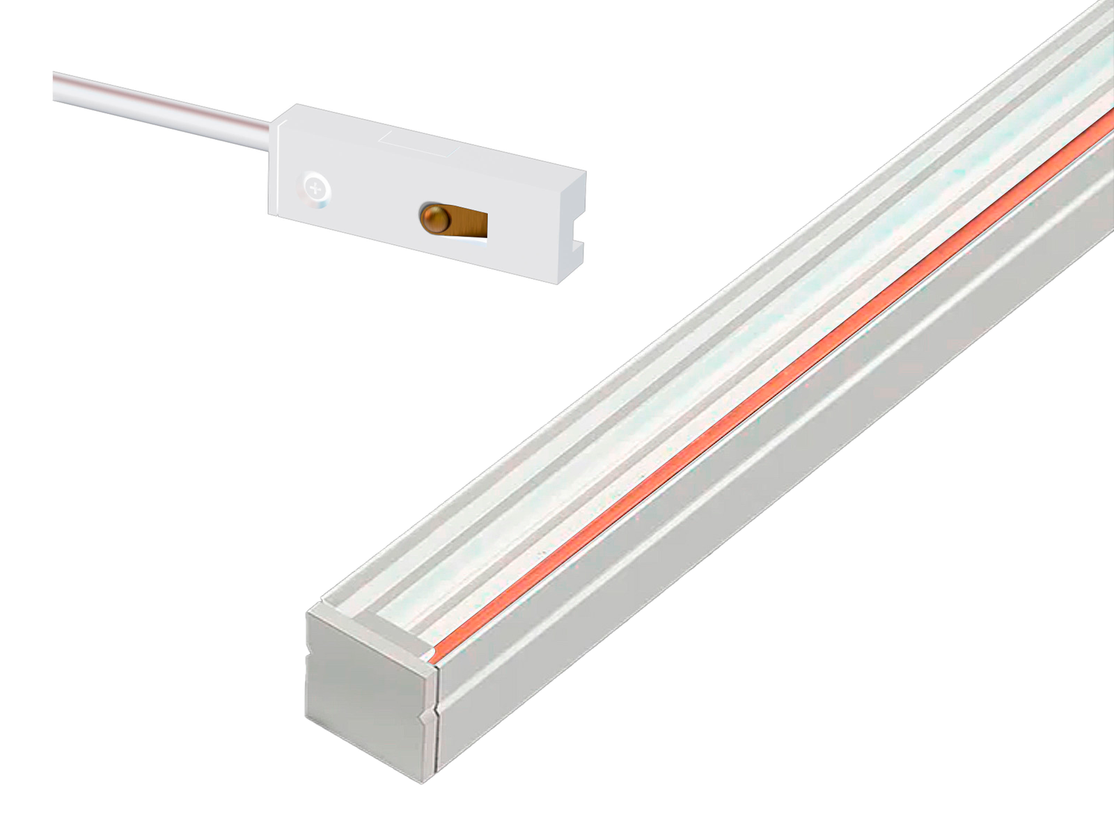 CLICK LED alu-strømskinne. hvid. 1.200x11x12 mm. inkl. strømadapter med DC han-stik. 2m ledning. cover og endestykke