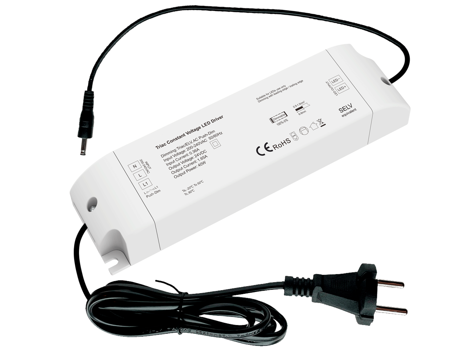 LED driver 24V 40W. Triac/Push dæmpbar. inkl. AC adapter og DC stik HAN (35135)