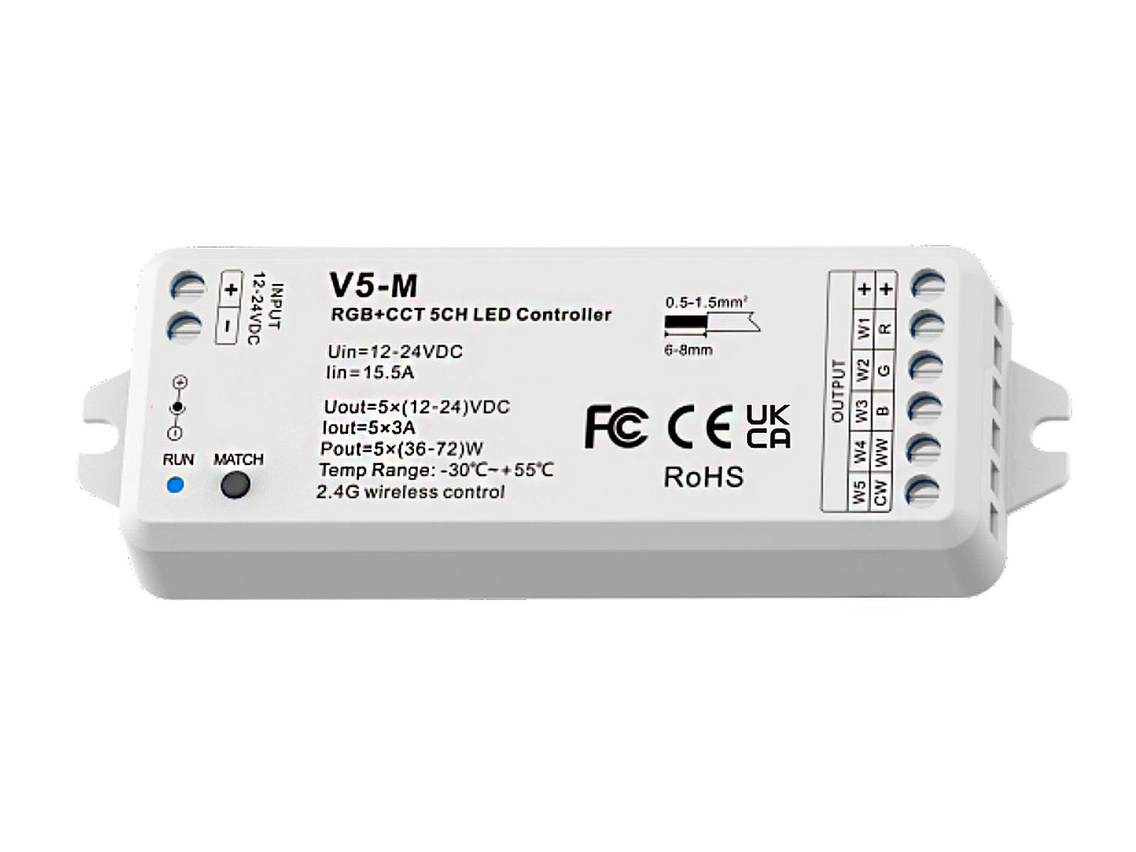LED dimming controller RF 2.4GHz. 5-kanals (RGBCTA). 12V(180W)/24V(360W)