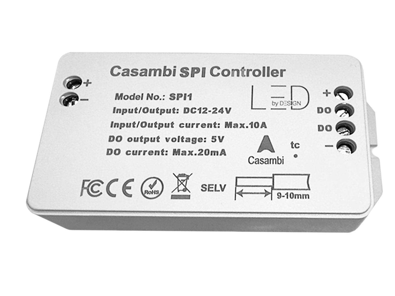 Casambi til SPI-controlleren fra LED BY DESIGN er en brugervenlig og nem at bruge enhed. Denne controller kan arbejde med SPI Pixel kontrolprotokoller og understøtter de fleste af de almindelige IC'er, der bruges i industrien. Enheden kan kontrollere op til 512 pixels (IC'er) RGB og RGBW.