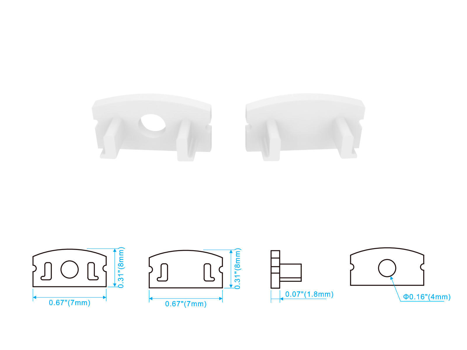 Endestykke-sæt. HVID. for 17x7 mm alu-profil (1 m. hul / 1 uden)