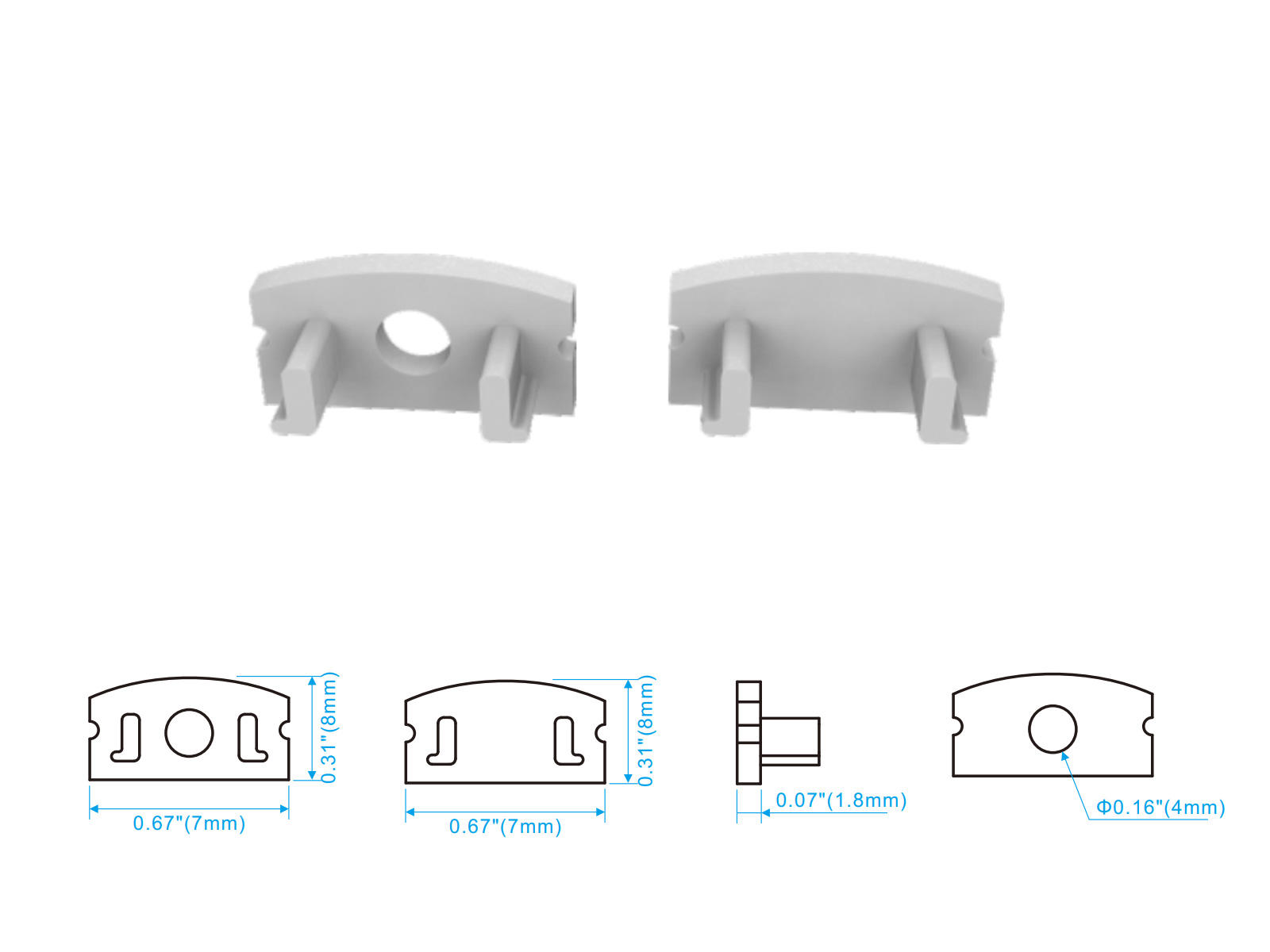 Endestykke-sæt. lysegrå. for 17x7 mm alu-profil (1 m. hul/1 uden)